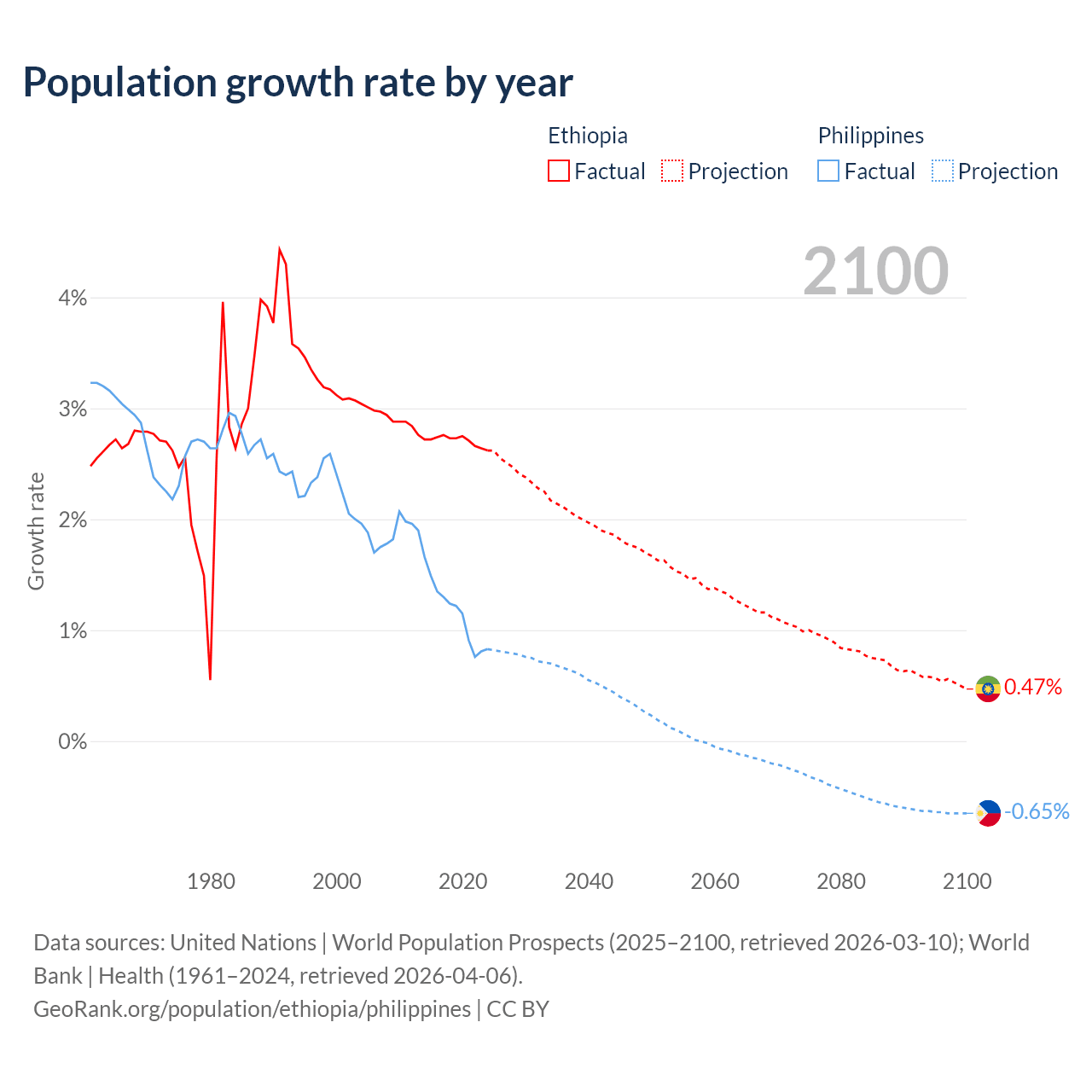 - For the last 10 years, Ethiopia has had an average growth rate of +2.71% per year vs +1.16% in the Philippines.