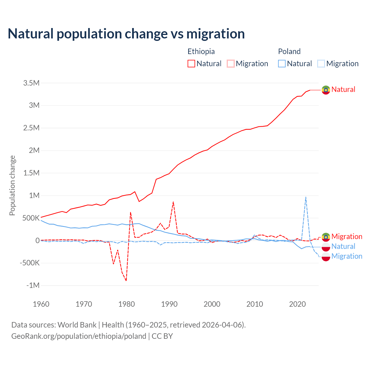 Over the last 10 years, 98.8% of the population change in Ethiopia is from natural causes (a gain of 30,237,373 people) and 1.19% is from migration (a gain of 365,488 people). In Poland 41.4% is from natural causes (a loss of 675,443 people) and 58.6% is from migration (a gain of 955,766 people).