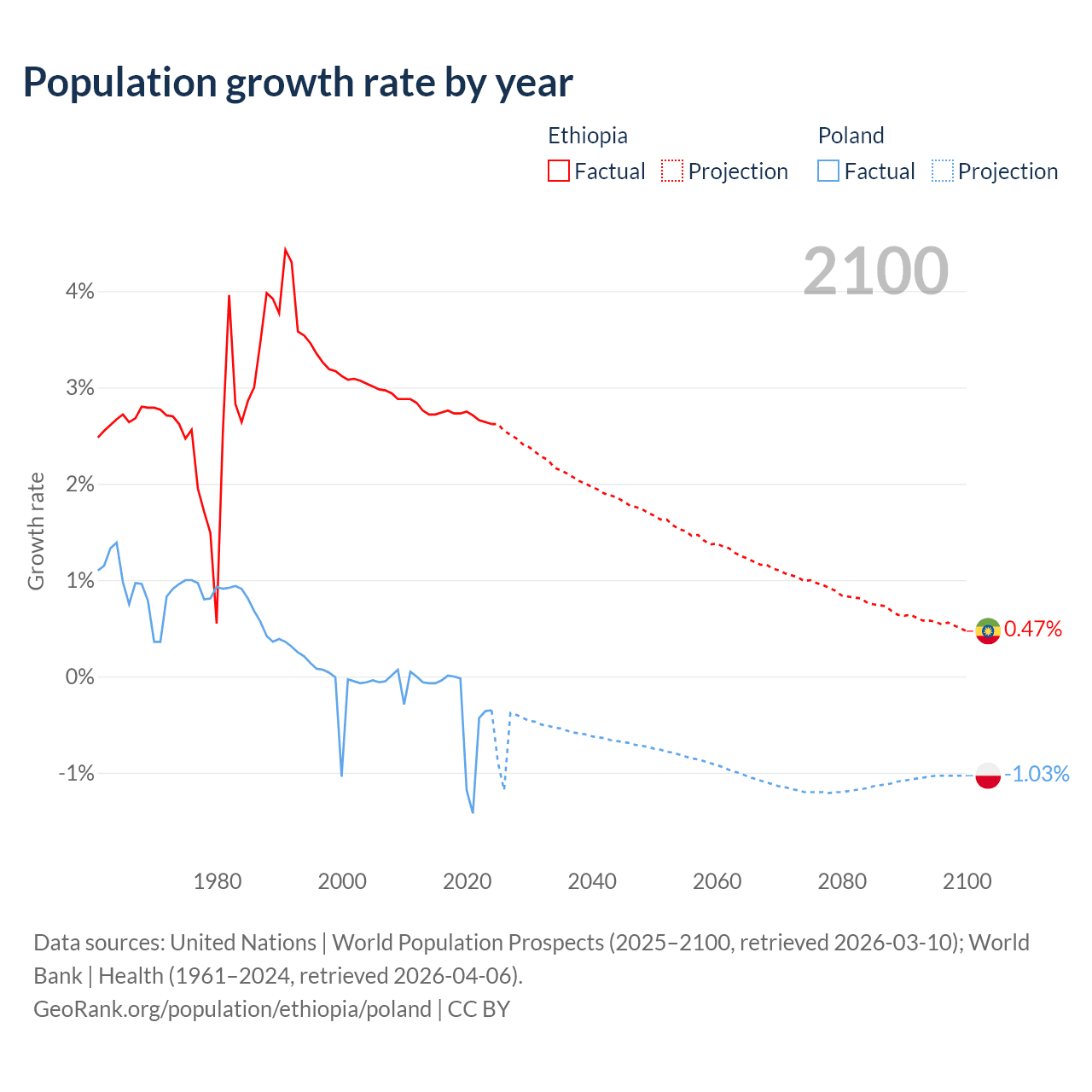 - For the last 10 years, Ethiopia has had an average growth rate of +2.71% per year vs -0.36% in Poland.