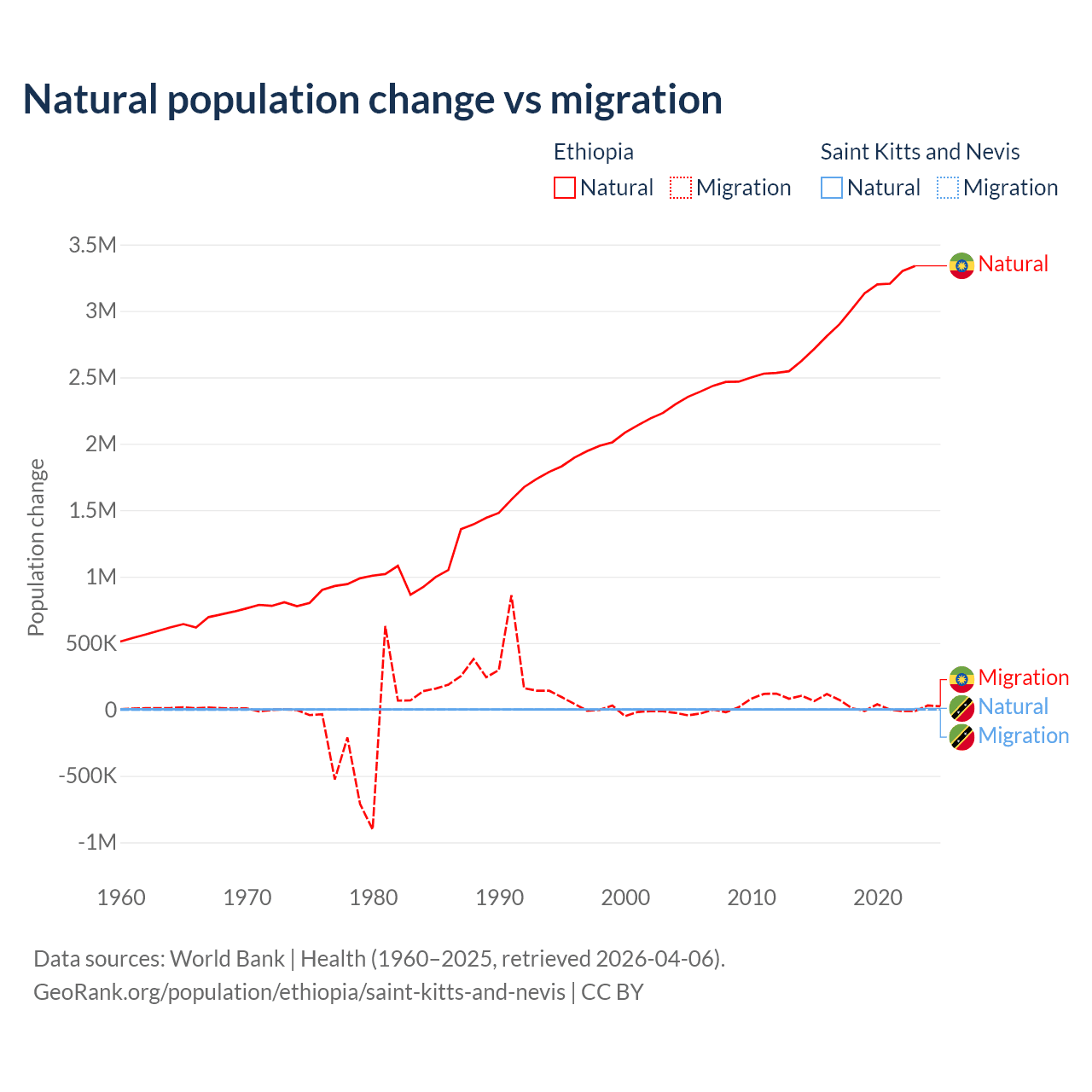Over the last 10 years, 98.8% of the population change in Ethiopia is from natural causes (a gain of 30,237,373 people) and 1.19% is from migration (a gain of 365,488 people). In Saint Kitts and Nevis 44.9% is from natural causes (a gain of 1,225 people) and 55.1% is from migration (a loss of 1,506 people).