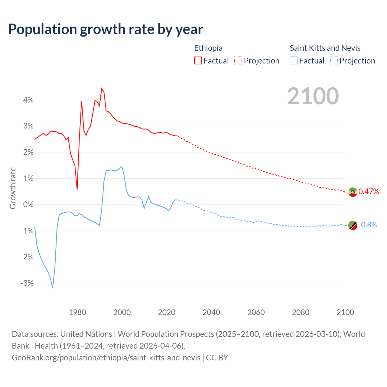 - For the last 10 years, Ethiopia has had an average growth rate of +2.71% per year vs -0.04% in Saint Kitts and Nevis.