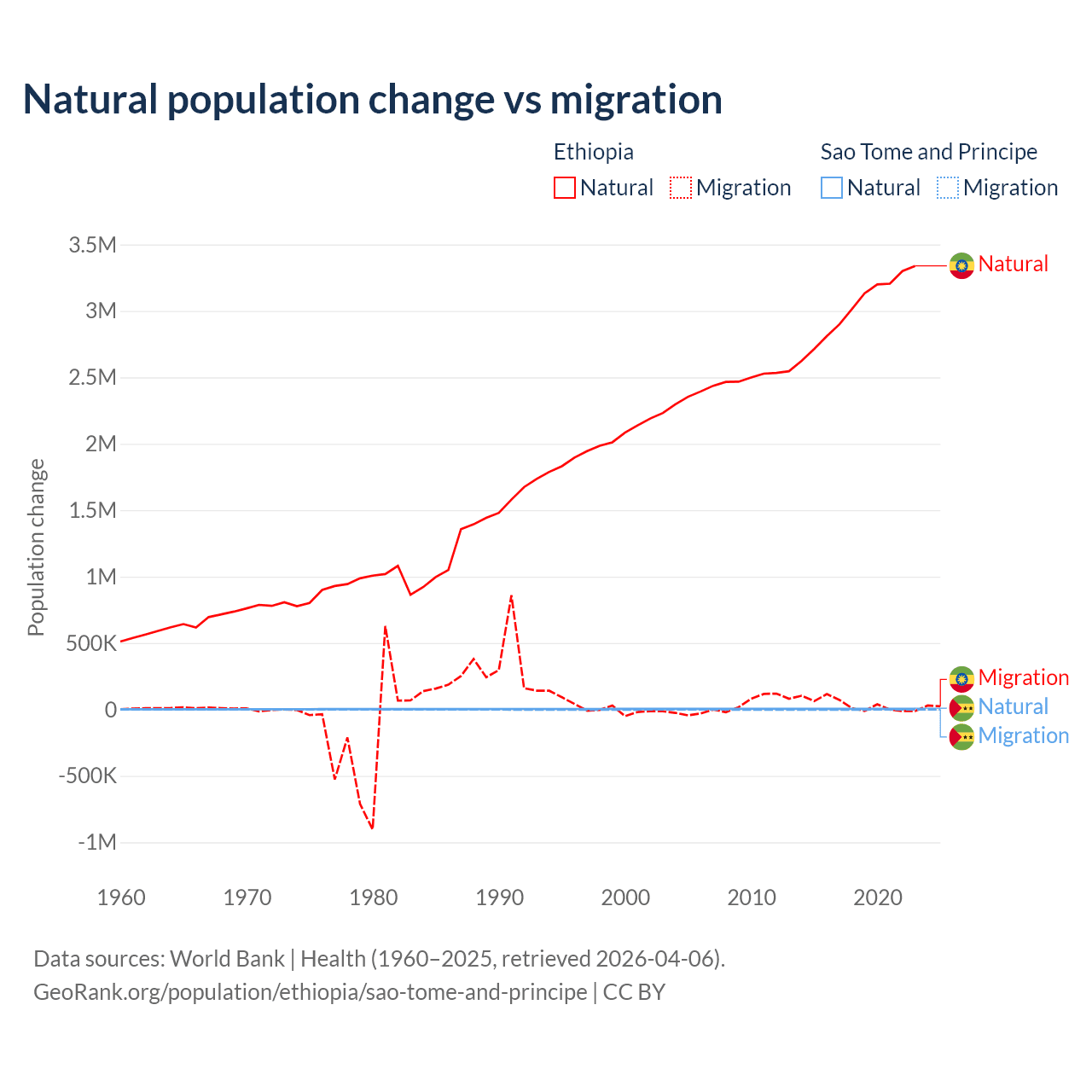 Over the last 10 years, 98.8% of the population change in Ethiopia is from natural causes (a gain of 30,237,373 people) and 1.19% is from migration (a gain of 365,488 people). In Sao Tome and Principe 80.1% is from natural causes (a gain of 50,822 people) and 19.9% is from migration (a loss of 12,621 people).