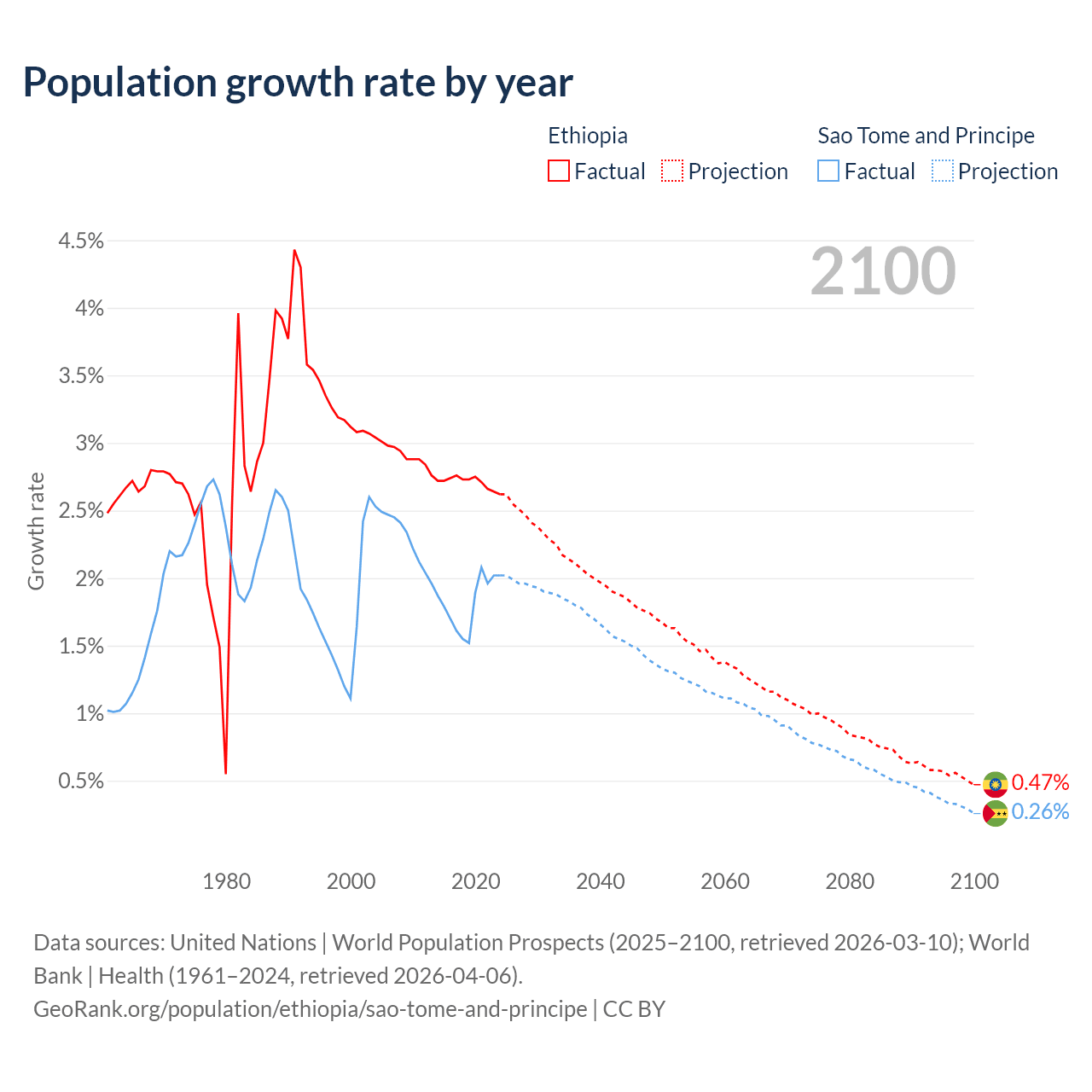 - For the last 10 years, Ethiopia has had an average growth rate of +2.71% per year vs +1.82% in Sao Tome and Principe.