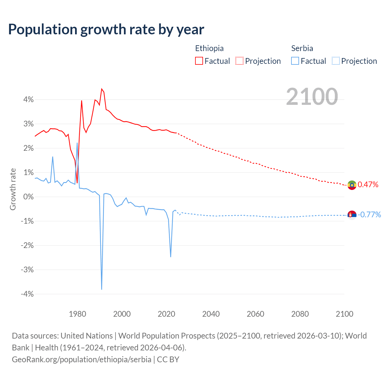 - For the last 10 years, Ethiopia has had an average growth rate of +2.71% per year vs -0.76% in Serbia.