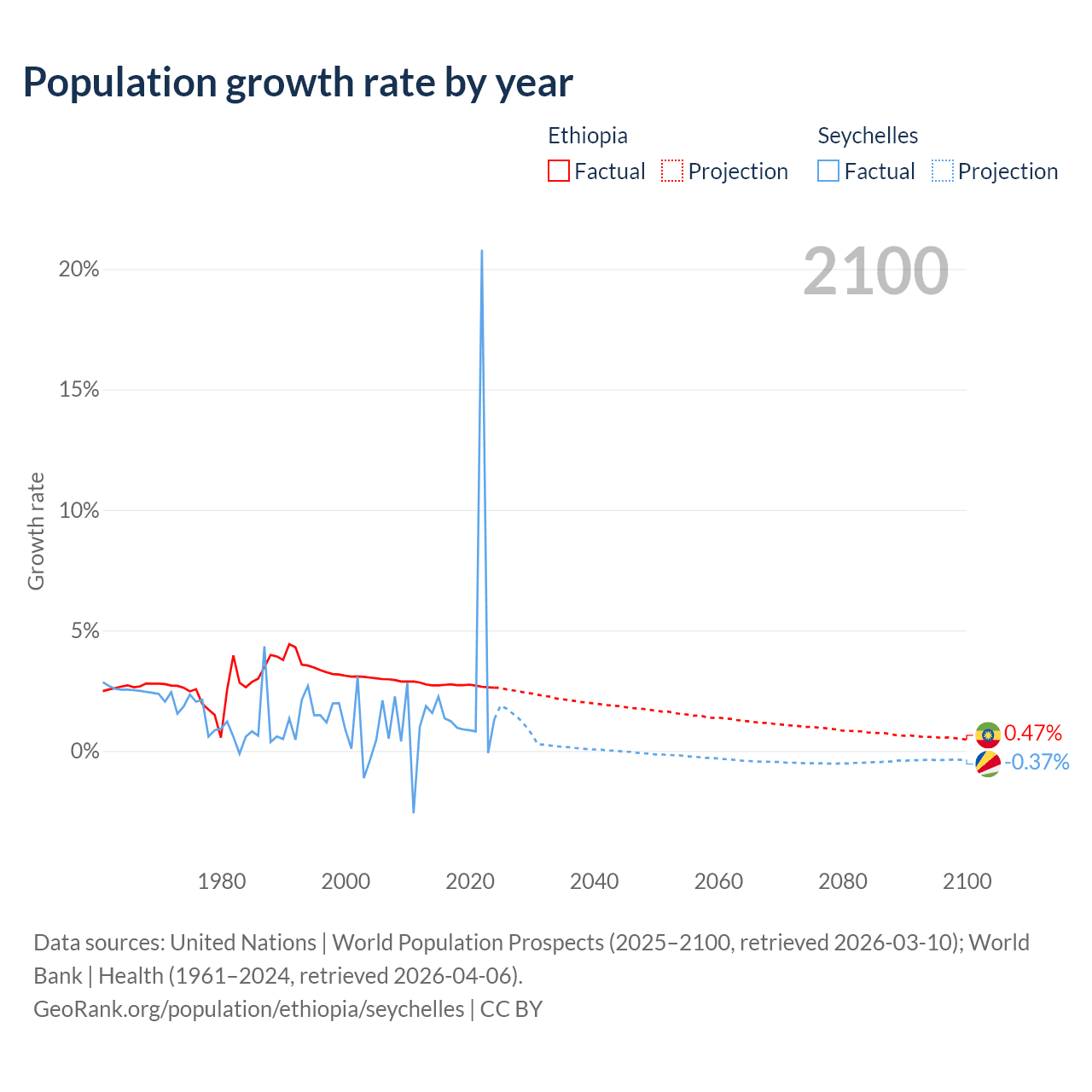 - For the last 10 years, Ethiopia has had an average growth rate of +2.71% per year vs +2.9% in the Seychelles.