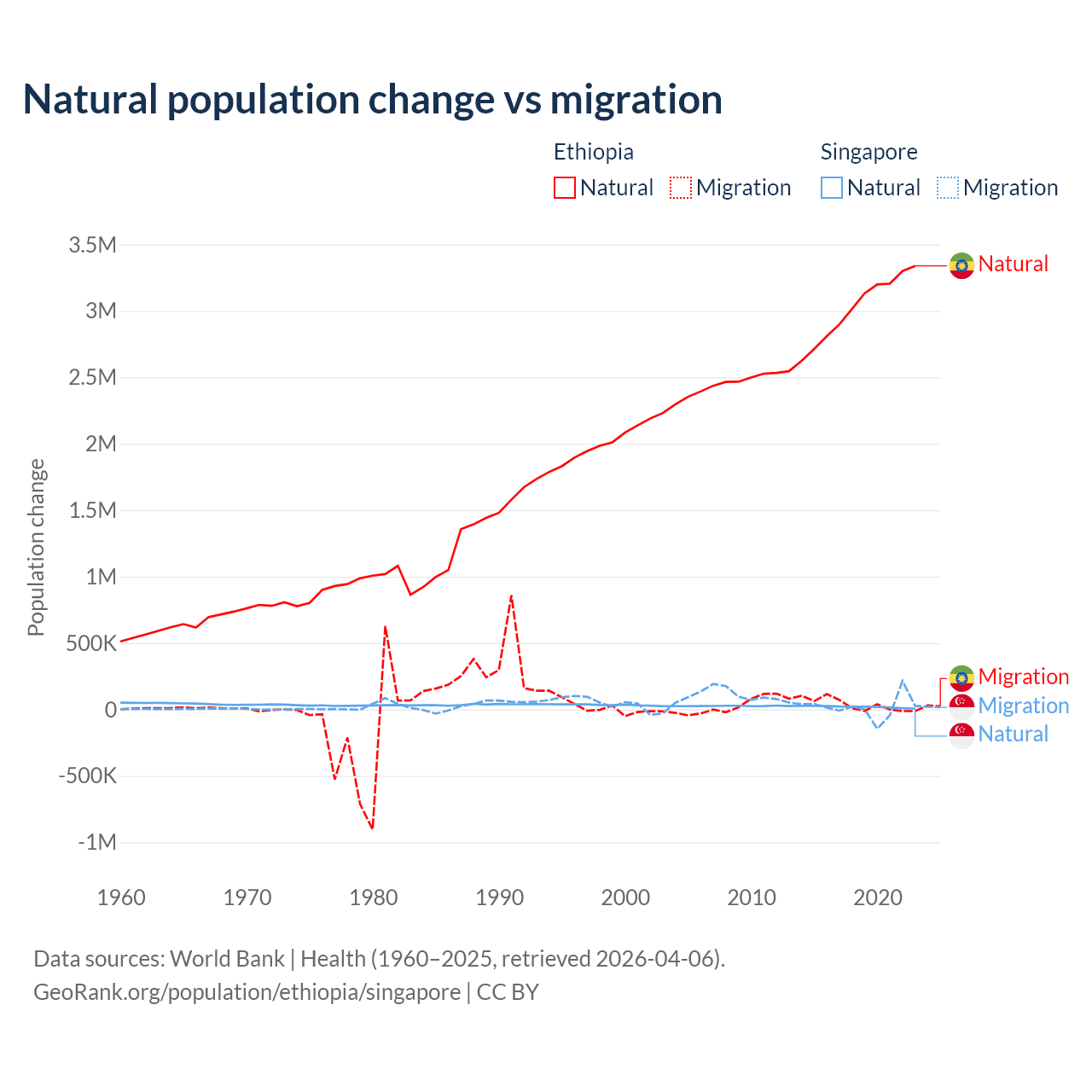 Over the last 10 years, 98.8% of the population change in Ethiopia is from natural causes (a gain of 30,237,373 people) and 1.19% is from migration (a gain of 365,488 people). In Singapore 54.8% is from natural causes (a gain of 195,953 people) and 45.2% is from migration (a gain of 161,805 people).