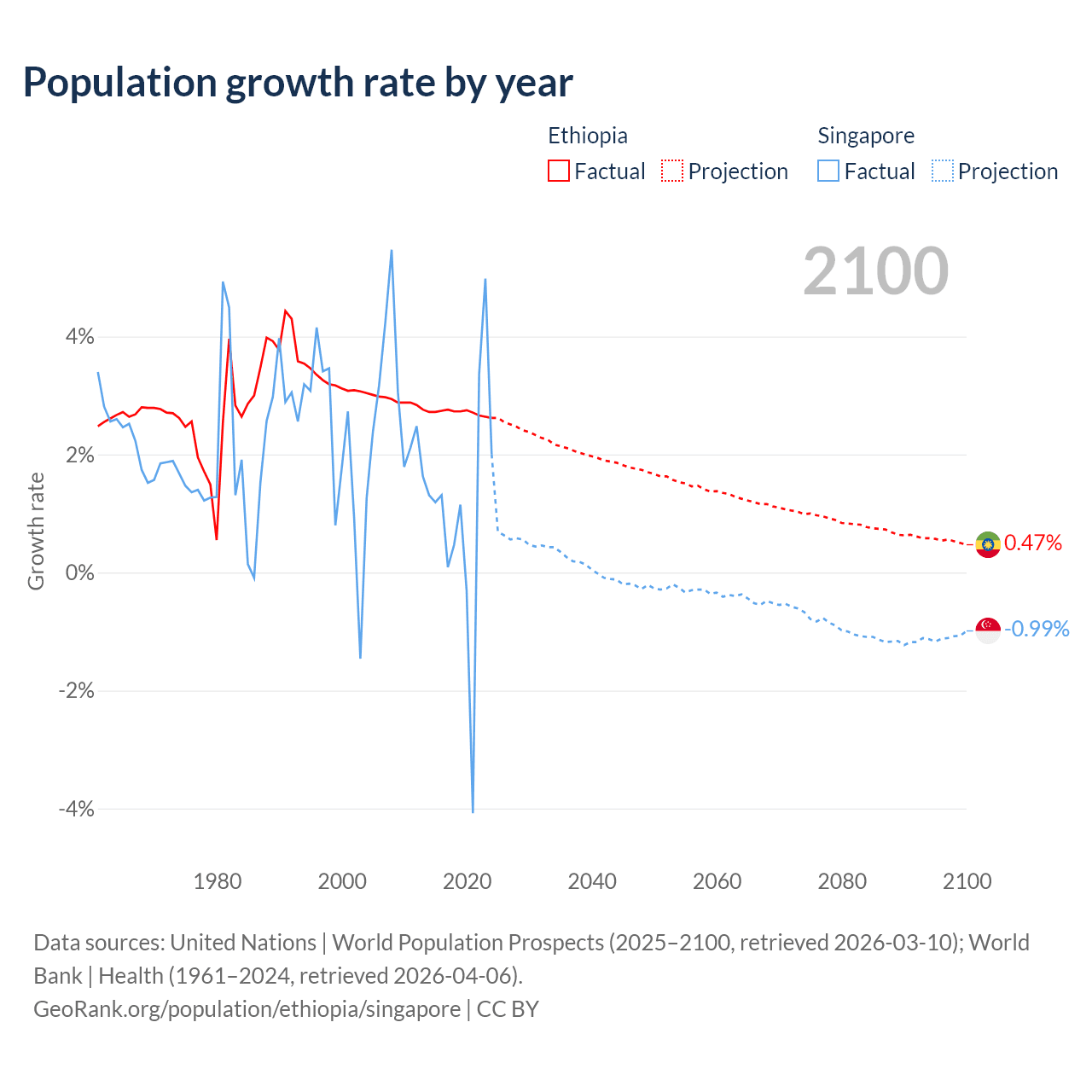 - For the last 10 years, Ethiopia has had an average growth rate of +2.71% per year vs +1.04% in Singapore.