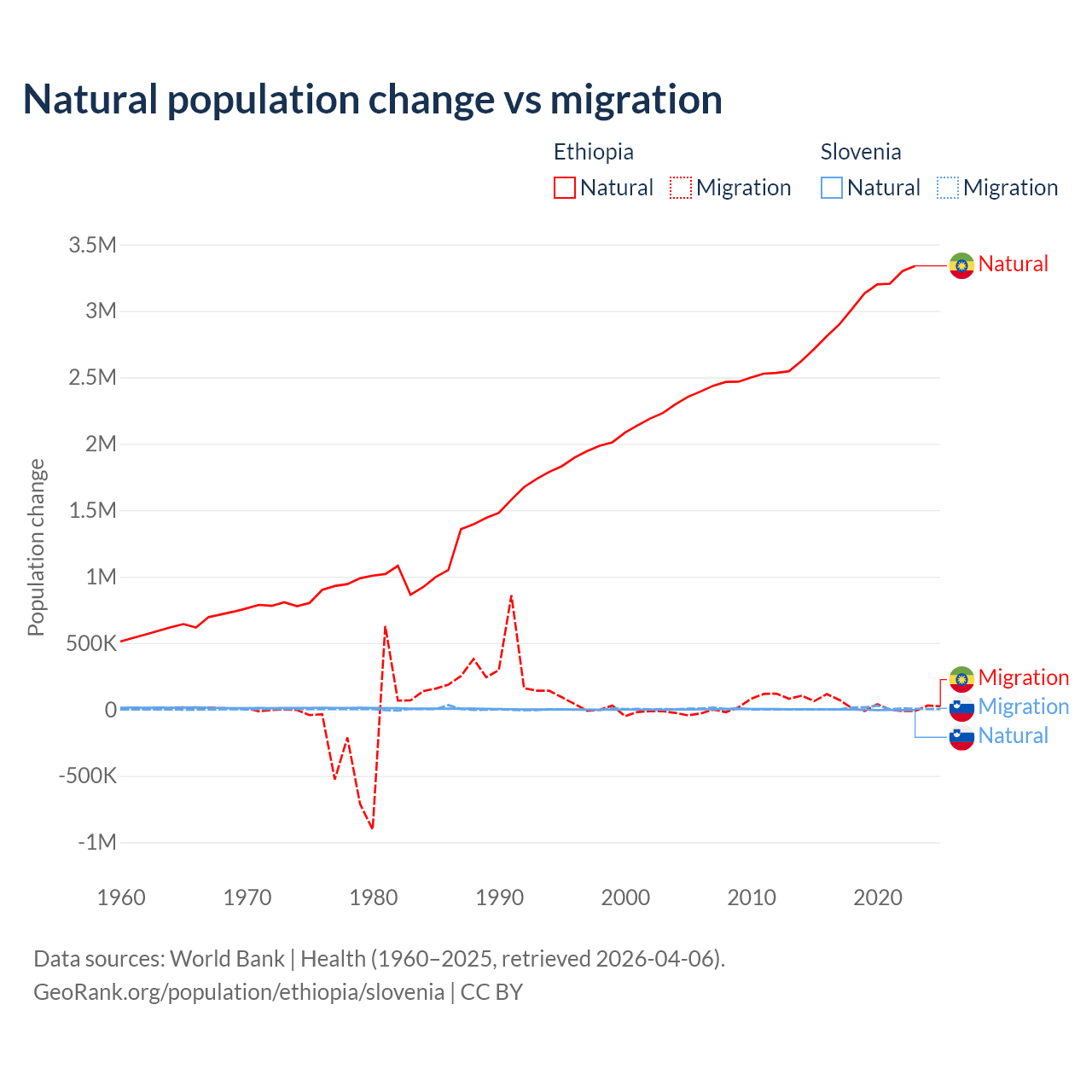 Over the last 10 years, 98.8% of the population change in Ethiopia is from natural causes (a gain of 30,237,373 people) and 1.19% is from migration (a gain of 365,488 people). In Slovenia 18.1% is from natural causes (a loss of 17,573 people) and 81.9% is from migration (a gain of 79,532 people).