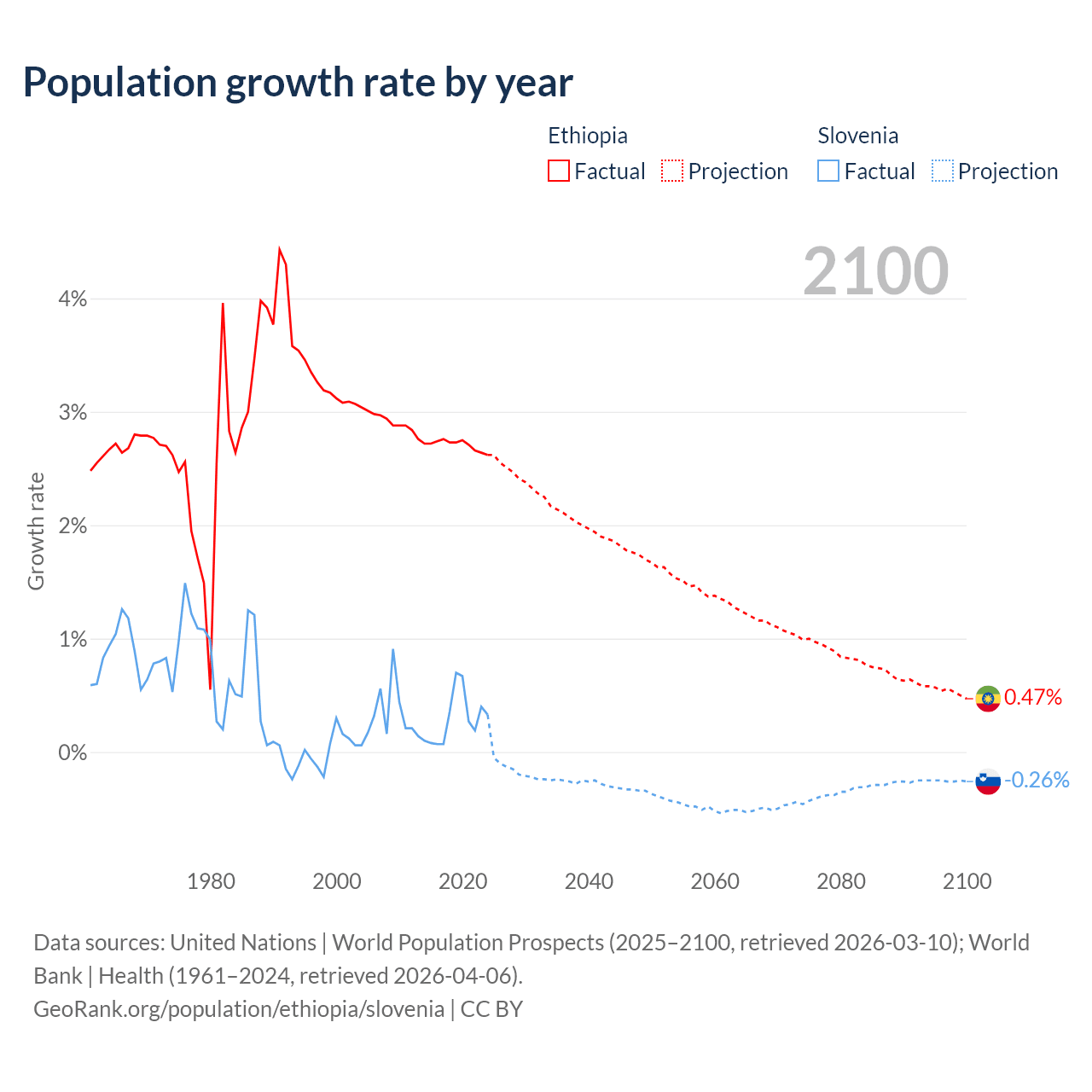 - For the last 10 years, Ethiopia has had an average growth rate of +2.71% per year vs +0.29% in Slovenia.