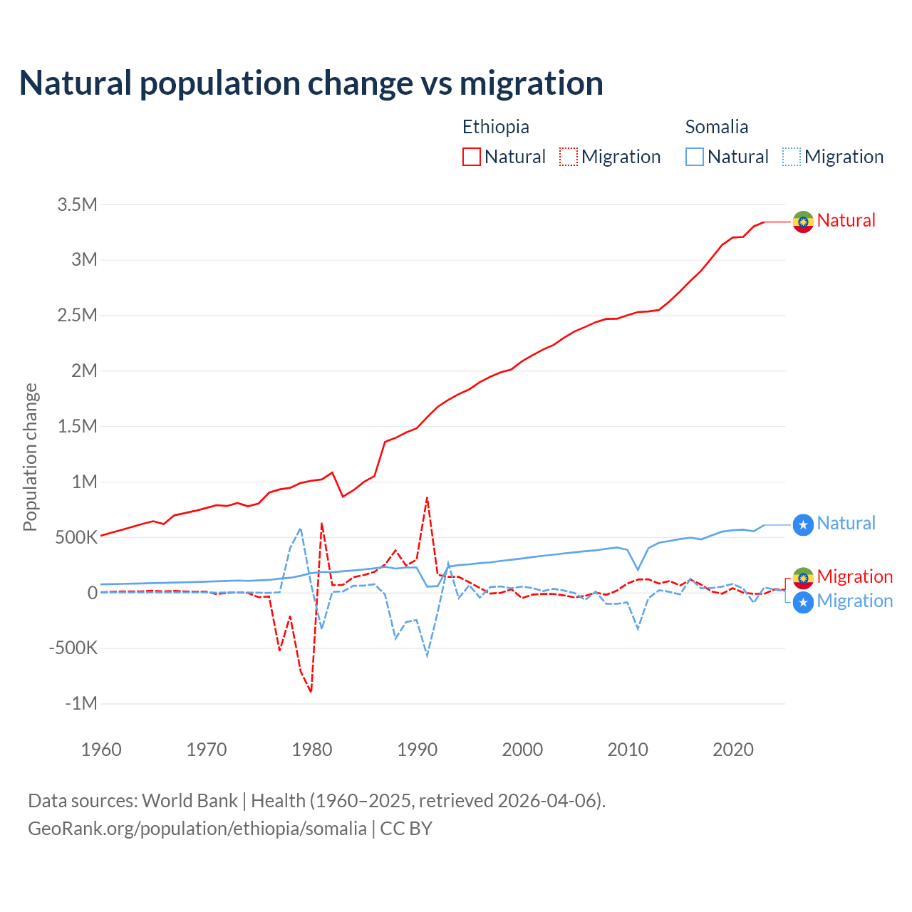 Over the last 10 years, 98.8% of the population change in Ethiopia is from natural causes (a gain of 30,237,373 people) and 1.19% is from migration (a gain of 365,488 people). In Somalia 94.4% is from natural causes (a gain of 5,270,105 people) and 5.58% is from migration (a gain of 311,487 people).