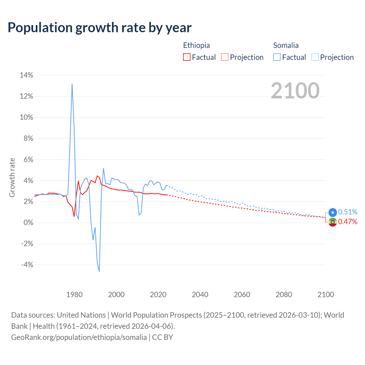 - For the last 10 years, Ethiopia has had an average growth rate of +2.71% per year vs +3.61% in Somalia.
