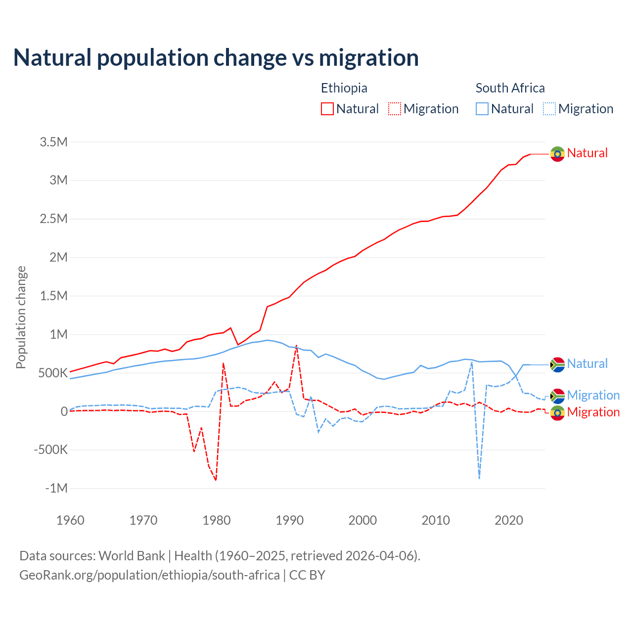 Over the last 10 years, 98.8% of the population change in Ethiopia is from natural causes (a gain of 30,237,373 people) and 1.19% is from migration (a gain of 365,488 people). In South Africa 72.8% is from natural causes (a gain of 6,190,027 people) and 27.2% is from migration (a gain of 2,316,795 people).