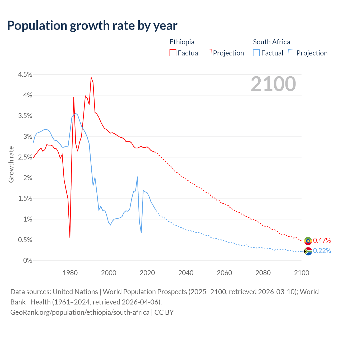 - For the last 10 years, Ethiopia has had an average growth rate of +2.71% per year vs +1.44% in South Africa.