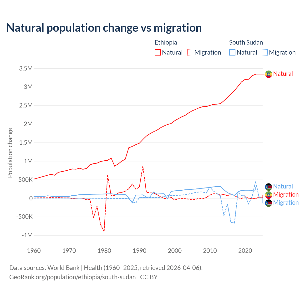 Over the last 10 years, 98.8% of the population change in Ethiopia is from natural causes (a gain of 30,237,373 people) and 1.19% is from migration (a gain of 365,488 people). In South Sudan 57.4% is from natural causes (a gain of 1,792,135 people) and 42.6% is from migration (a loss of 1,329,606 people).