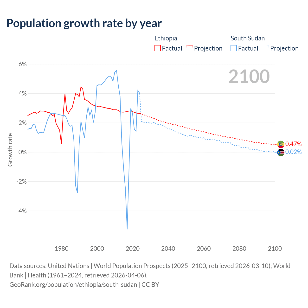 - For the last 10 years, Ethiopia has had an average growth rate of +2.71% per year vs +0.65% in South Sudan.