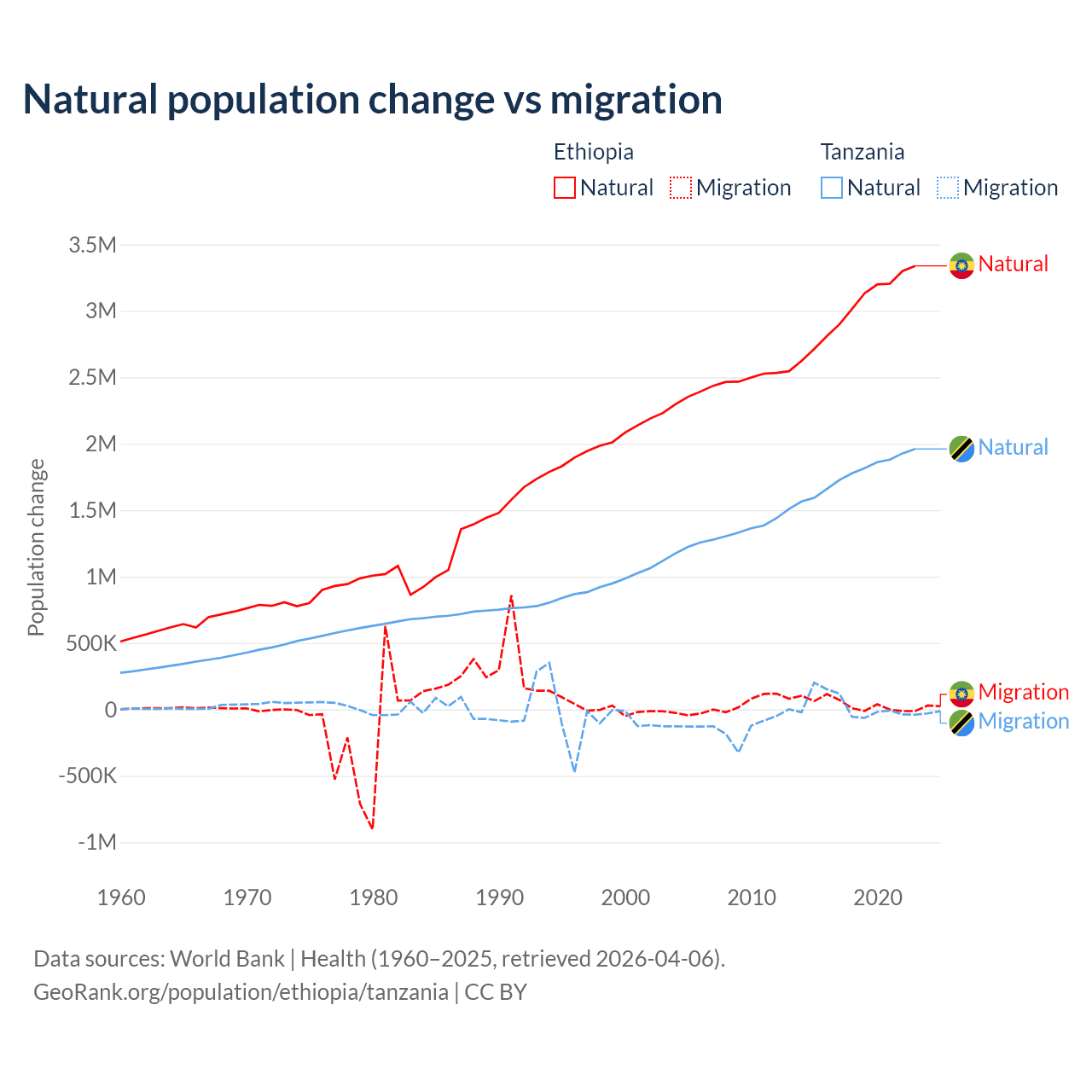 Over the last 10 years, 98.8% of the population change in Ethiopia is from natural causes (a gain of 30,237,373 people) and 1.19% is from migration (a gain of 365,488 people). In Tanzania 98.7% is from natural causes (a gain of 17,769,541 people) and 1.27% is from migration (a gain of 229,466 people).