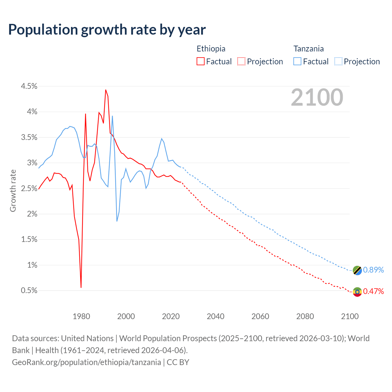 - For the last 10 years, Ethiopia has had an average growth rate of +2.71% per year vs +3.13% in Tanzania.