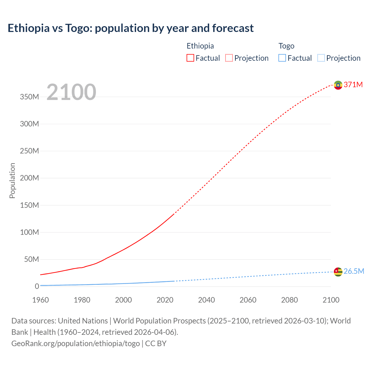 The latest officially reported population of Ethiopia was 132,059,767 in 2024 vs 9,515,236 people in Togo in 2024. In 2026, based on the adjusted UN estimation, the current Ethiopia's population is 139,917,664 people compared to 9,990,340 in Togo.