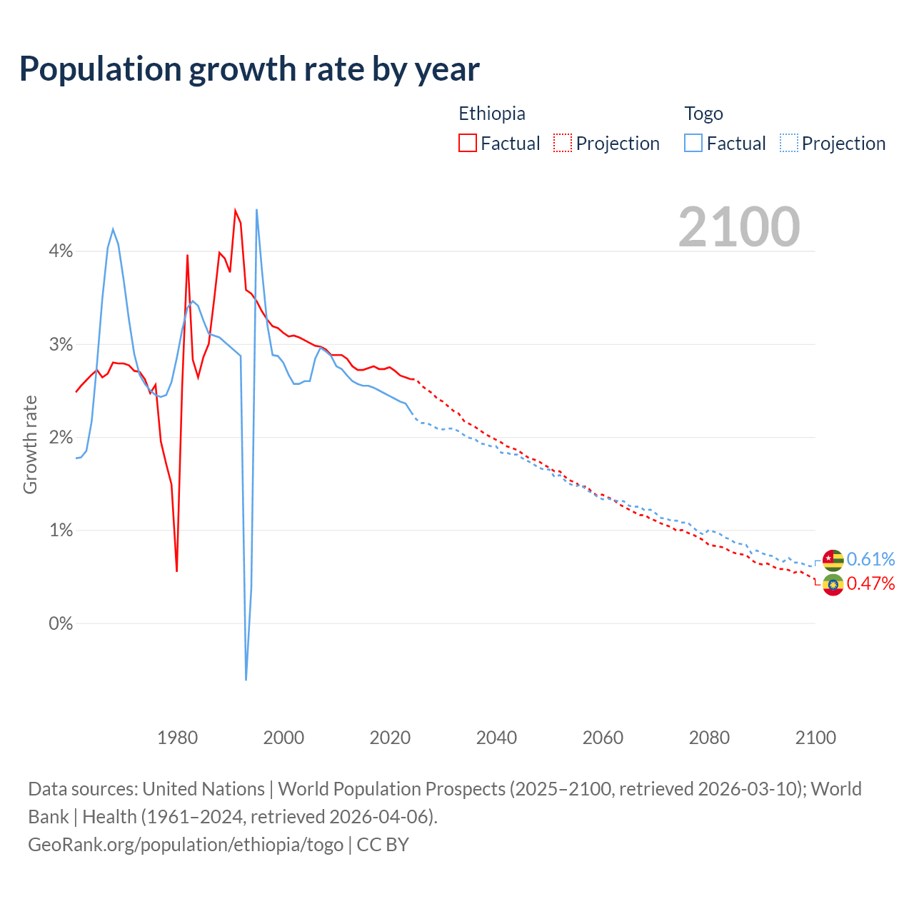 - For the last 10 years, Ethiopia has had an average growth rate of +2.71% per year vs +2.46% in Togo.