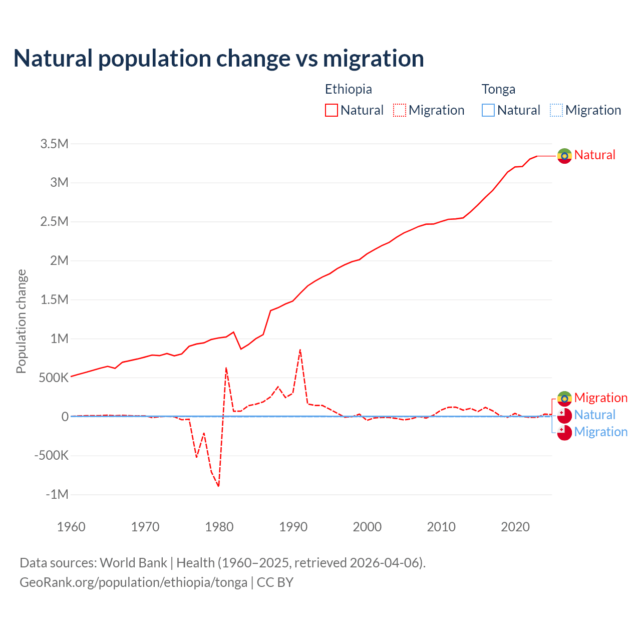 Over the last 10 years, 98.8% of the population change in Ethiopia is from natural causes (a gain of 30,237,373 people) and 1.19% is from migration (a gain of 365,488 people). In Tonga 46.9% is from natural causes (a gain of 18,919 people) and 53.1% is from migration (a loss of 21,384 people).