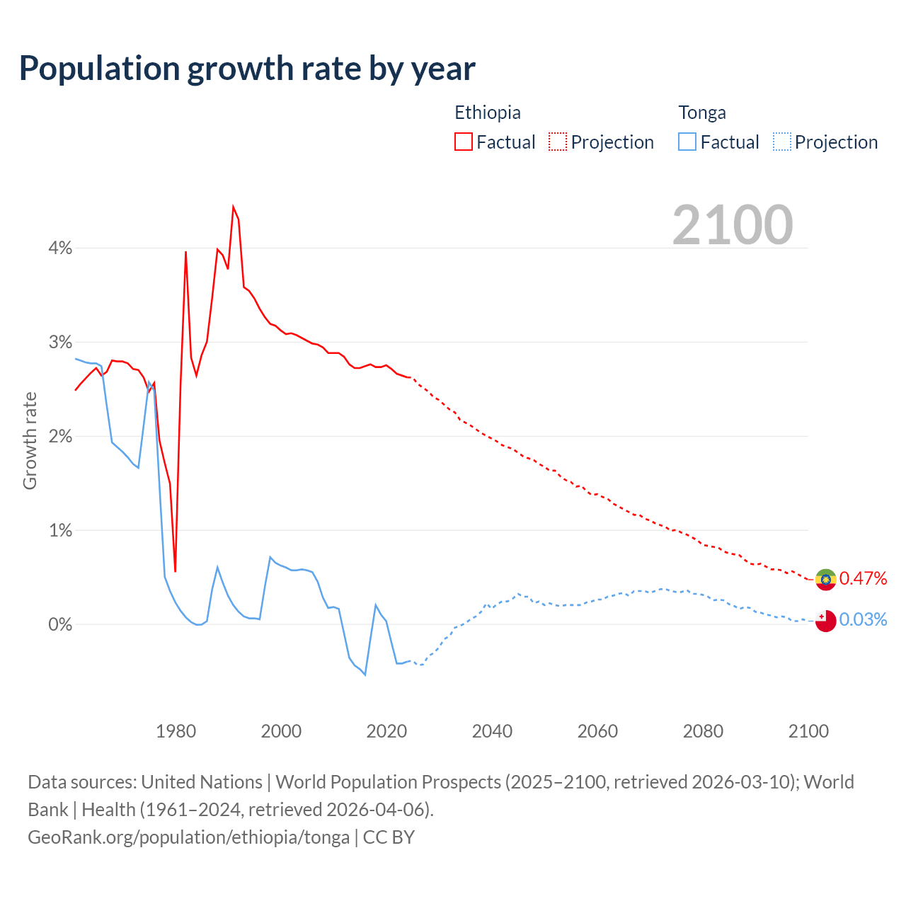 - For the last 10 years, Ethiopia has had an average growth rate of +2.71% per year vs -0.25% in Tonga.
