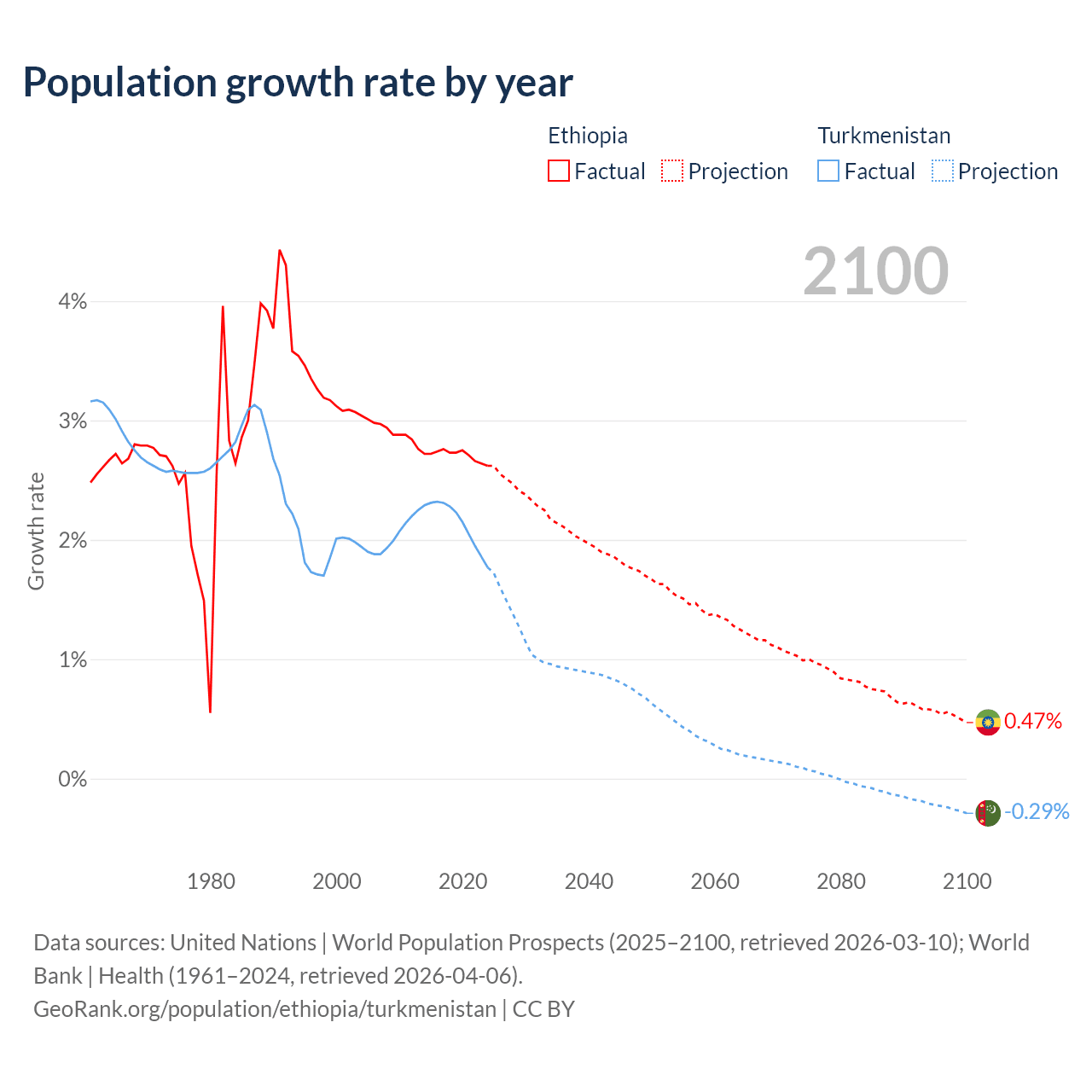 - For the last 10 years, Ethiopia has had an average growth rate of +2.71% per year vs +2.14% in Turkmenistan.