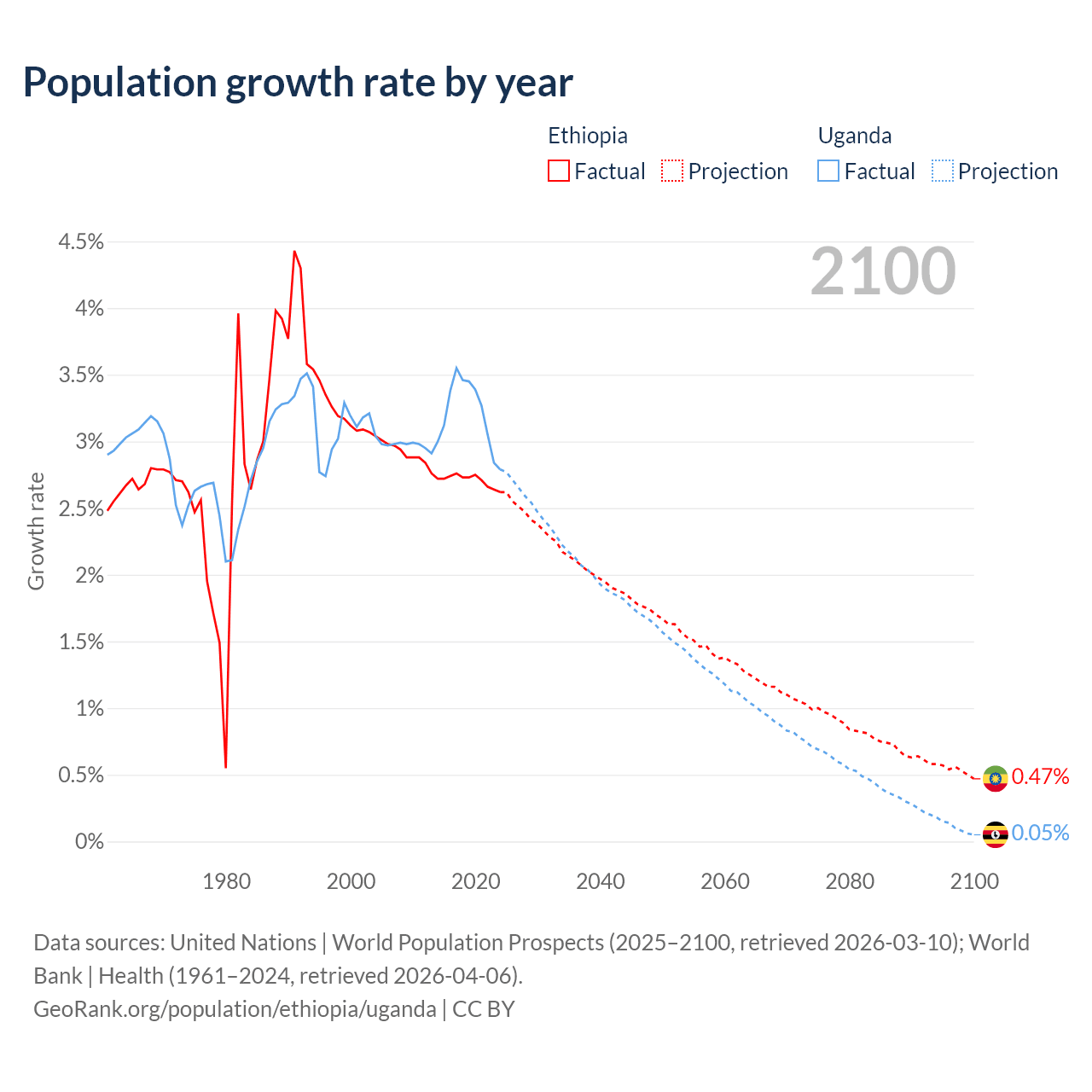 - For the last 10 years, Ethiopia has had an average growth rate of +2.71% per year vs +3.21% in Uganda.