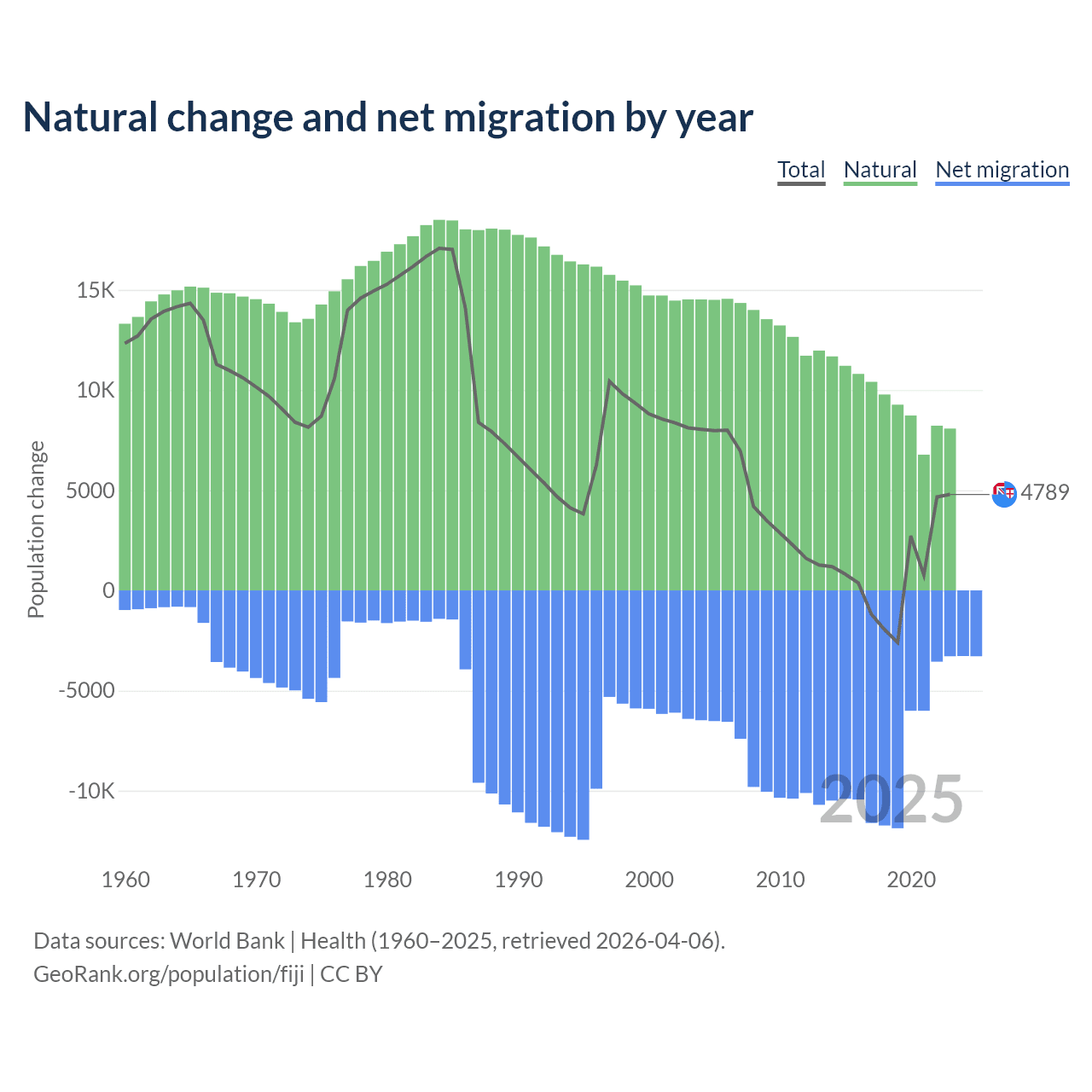 Over the last 10 years, 52.6% of the population change in Fiji is from natural causes (a gain of 94,971 people) and 47.4% is from migration (a loss of 85,415 people).