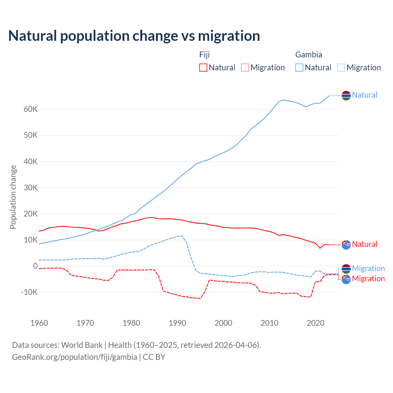 Over the last 10 years, 52.6% of the population change in Fiji is from natural causes (a gain of 94,971 people) and 47.4% is from migration (a loss of 85,415 people). In the Gambia 95.2% is from natural causes (a gain of 625,795 people) and 4.75% is from migration (a loss of 31,227 people).