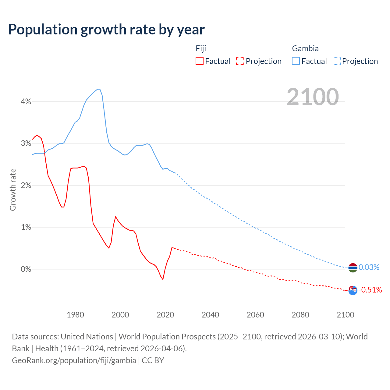 - For the last 10 years, Fiji has had an average growth rate of +0.12% per year vs +2.5% in the Gambia.