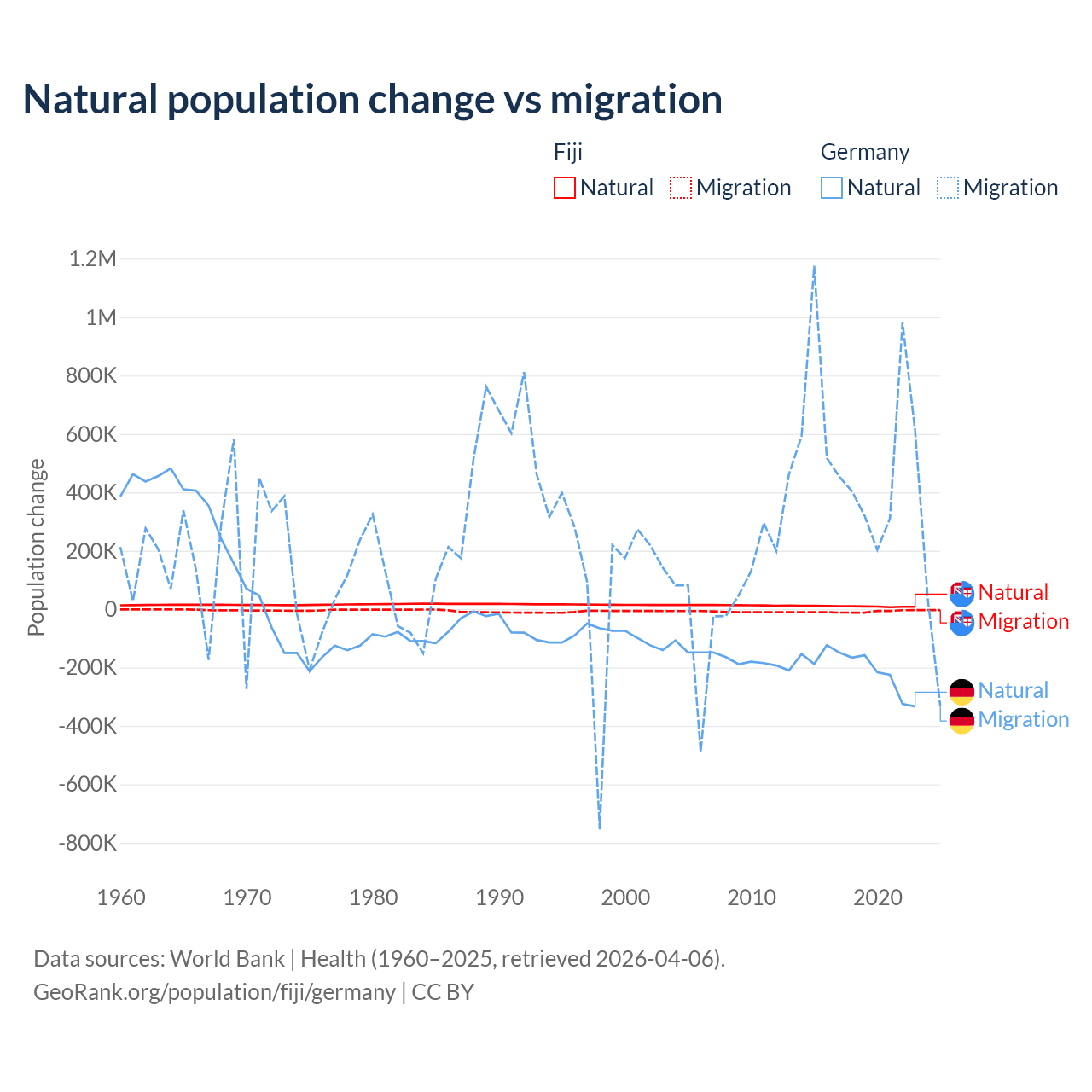 Over the last 10 years, 52.6% of the population change in Fiji is from natural causes (a gain of 94,971 people) and 47.4% is from migration (a loss of 85,415 people). In Germany 26.8% is from natural causes (a loss of 2,036,130 people) and 73.2% is from migration (a gain of 5,565,916 people).