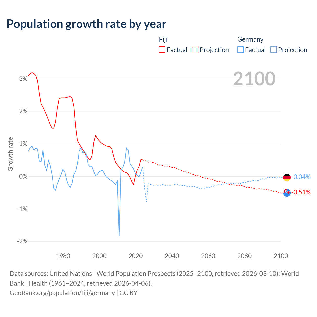 - For the last 10 years, Fiji has had an average growth rate of +0.12% per year vs +0.32% in Germany.