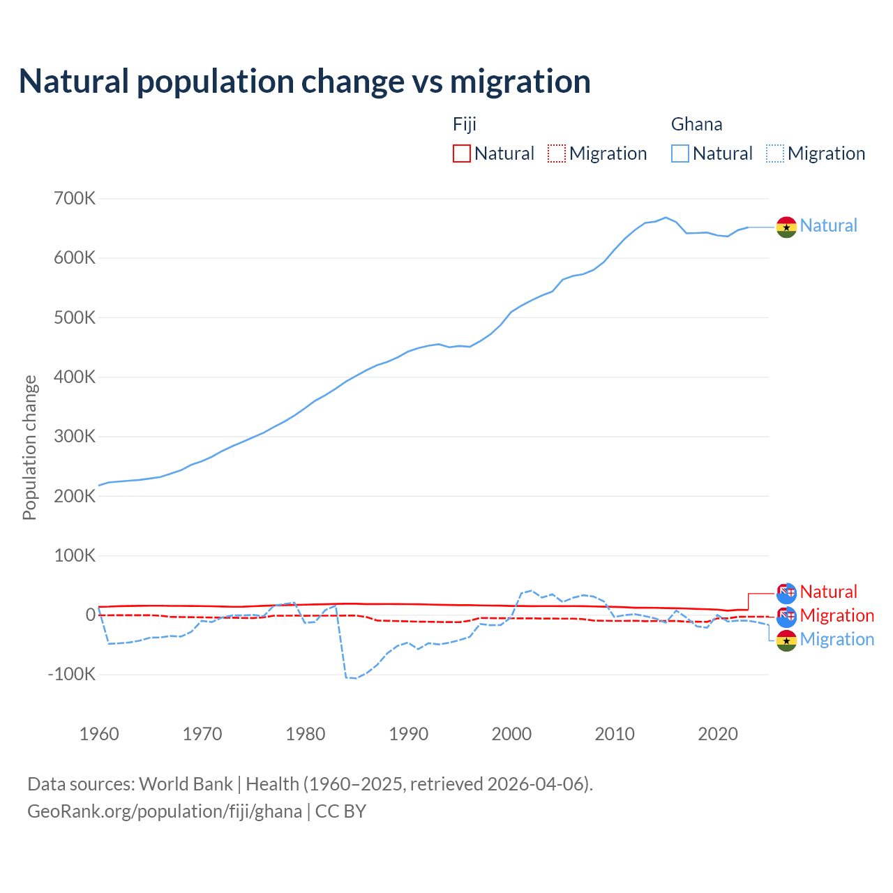Over the last 10 years, 52.6% of the population change in Fiji is from natural causes (a gain of 94,971 people) and 47.4% is from migration (a loss of 85,415 people). In Ghana 98.6% is from natural causes (a gain of 6,484,449 people) and 1.37% is from migration (a loss of 90,310 people).