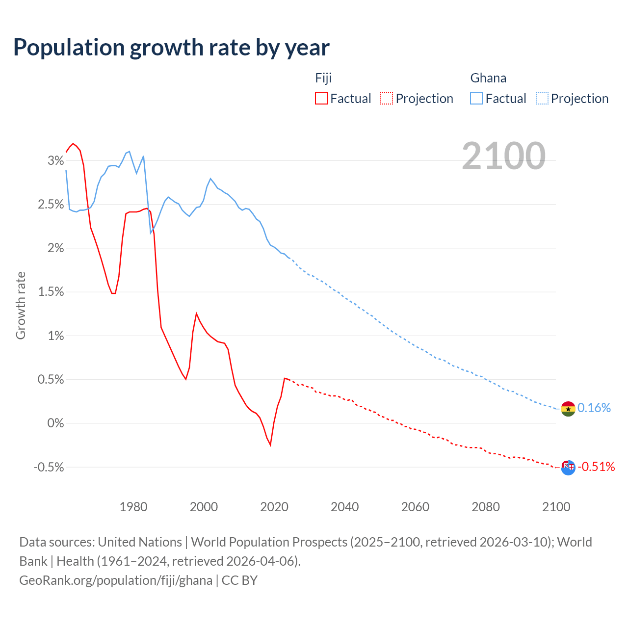 - For the last 10 years, Fiji has had an average growth rate of +0.12% per year vs +2.1% in Ghana.