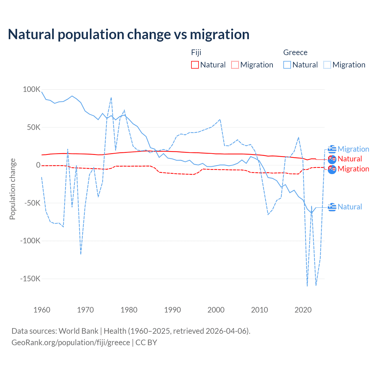 Over the last 10 years, 52.6% of the population change in Fiji is from natural causes (a gain of 94,971 people) and 47.4% is from migration (a loss of 85,415 people). In Greece 51.9% is from natural causes (a loss of 411,426 people) and 48.1% is from migration (a loss of 381,824 people).
