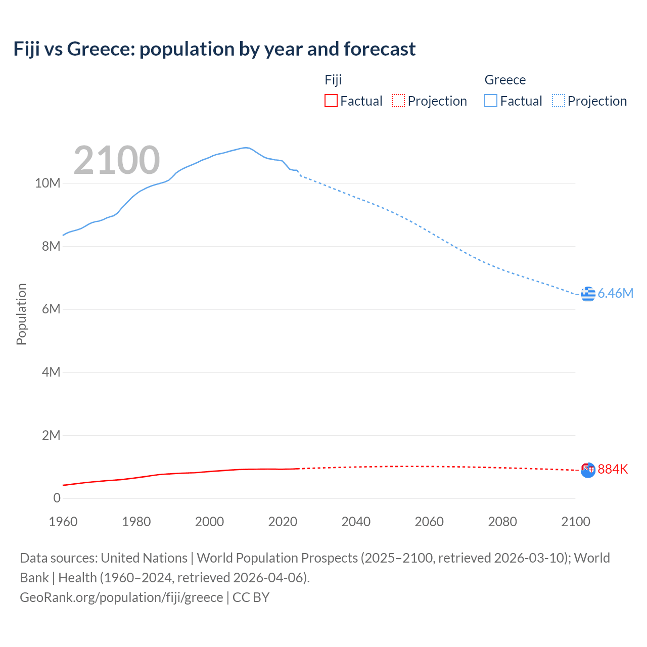 The latest officially reported population of Fiji was 928,784 in 2024 vs 10,405,134 people in Greece in 2024. In 2026, based on the adjusted UN estimation, the current Fiji's population is 938,628 people compared to 10,181,414 in Greece.