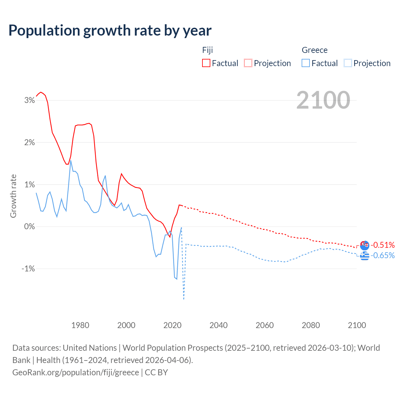 - For the last 10 years, Fiji has had an average growth rate of +0.12% per year vs -0.47% in Greece.