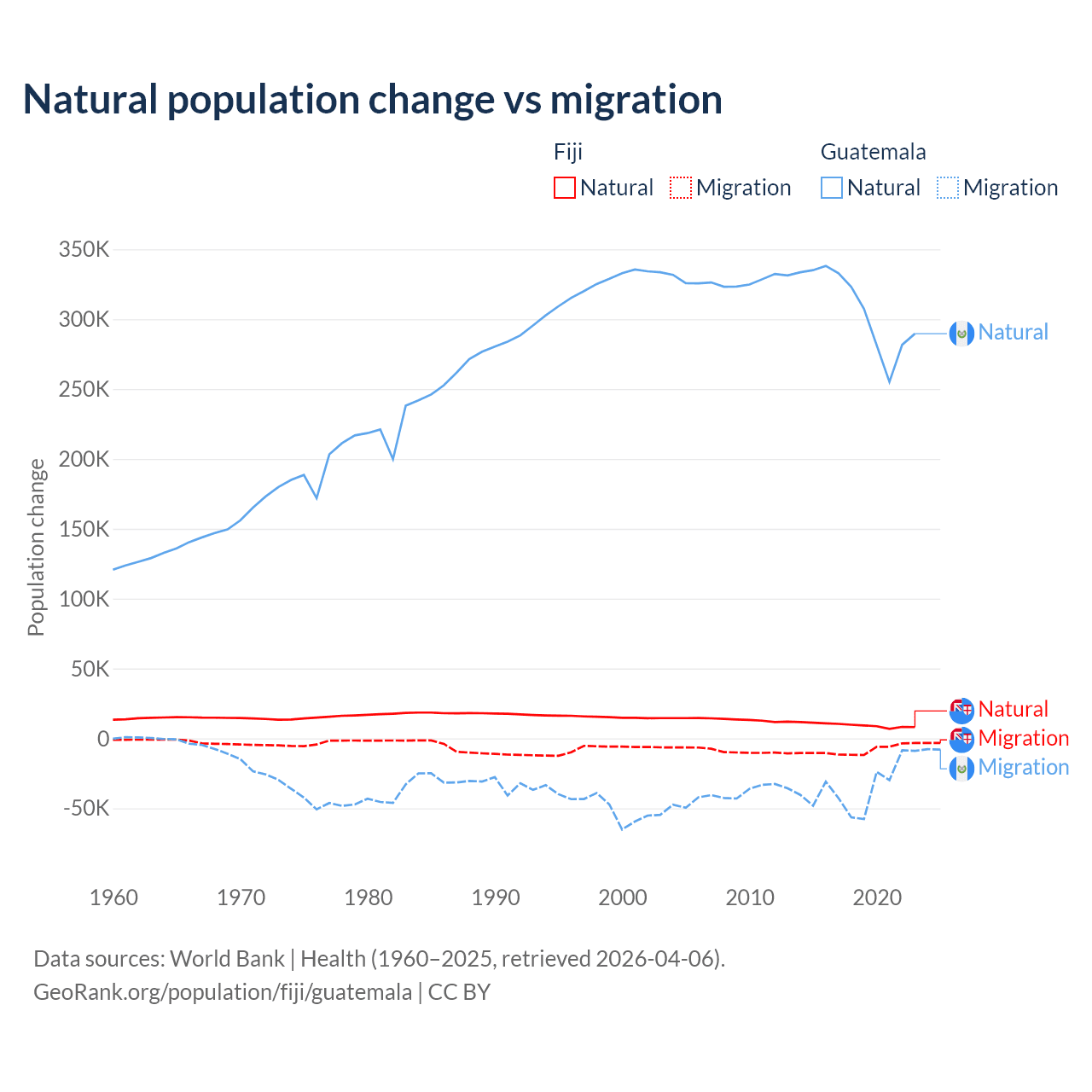 Over the last 10 years, 52.6% of the population change in Fiji is from natural causes (a gain of 94,971 people) and 47.4% is from migration (a loss of 85,415 people). In Guatemala 89.8% is from natural causes (a gain of 3,077,847 people) and 10.2% is from migration (a loss of 347,818 people).