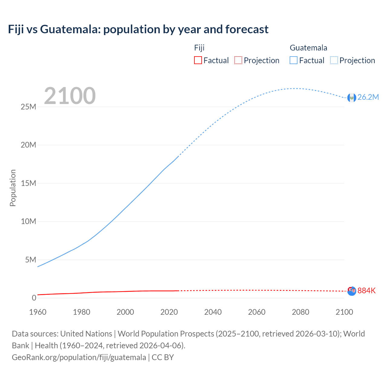 The latest officially reported population of Fiji was 928,784 in 2024 vs 18,406,359 people in Guatemala in 2024. In 2026, based on the adjusted UN estimation, the current Fiji's population is 938,628 people compared to 19,049,936 in Guatemala.