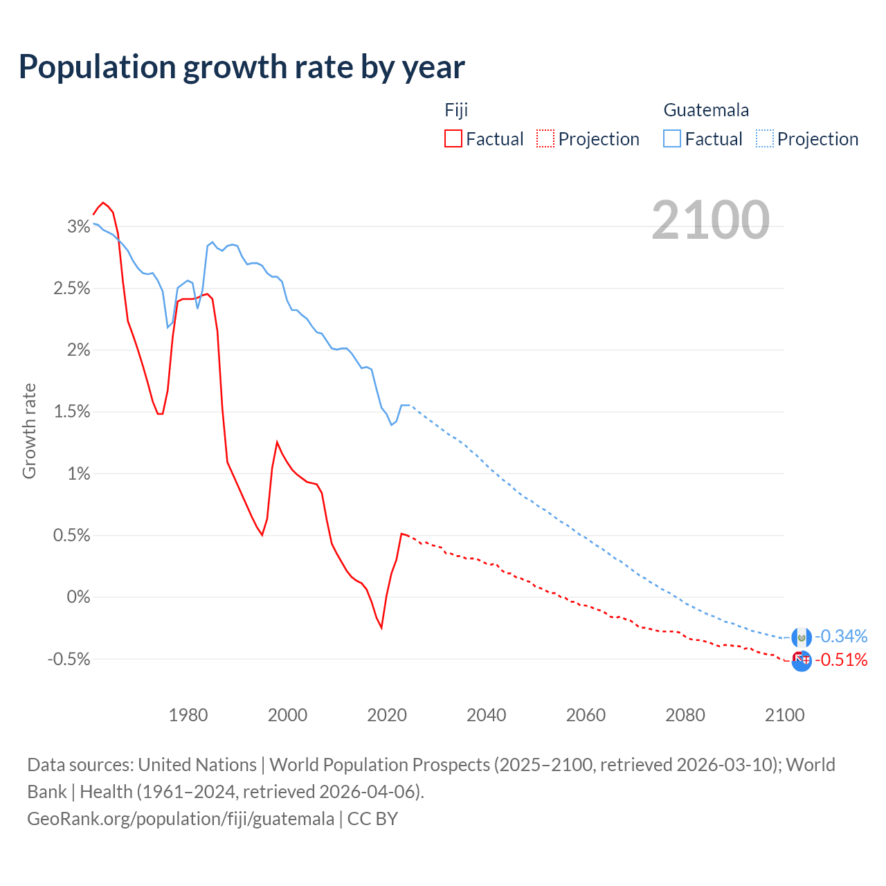 - For the last 10 years, Fiji has had an average growth rate of +0.12% per year vs +1.64% in Guatemala.