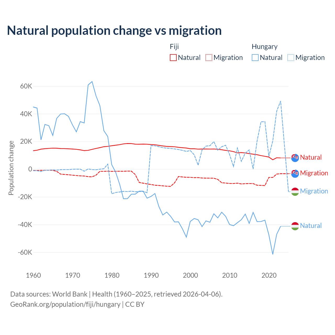 Over the last 10 years, 52.6% of the population change in Fiji is from natural causes (a gain of 94,971 people) and 47.4% is from migration (a loss of 85,415 people). In Hungary 63.7% is from natural causes (a loss of 412,838 people) and 36.3% is from migration (a gain of 234,837 people).