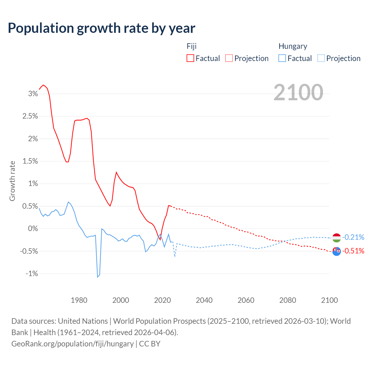 - For the last 10 years, Fiji has had an average growth rate of +0.12% per year vs -0.29% in Hungary.
