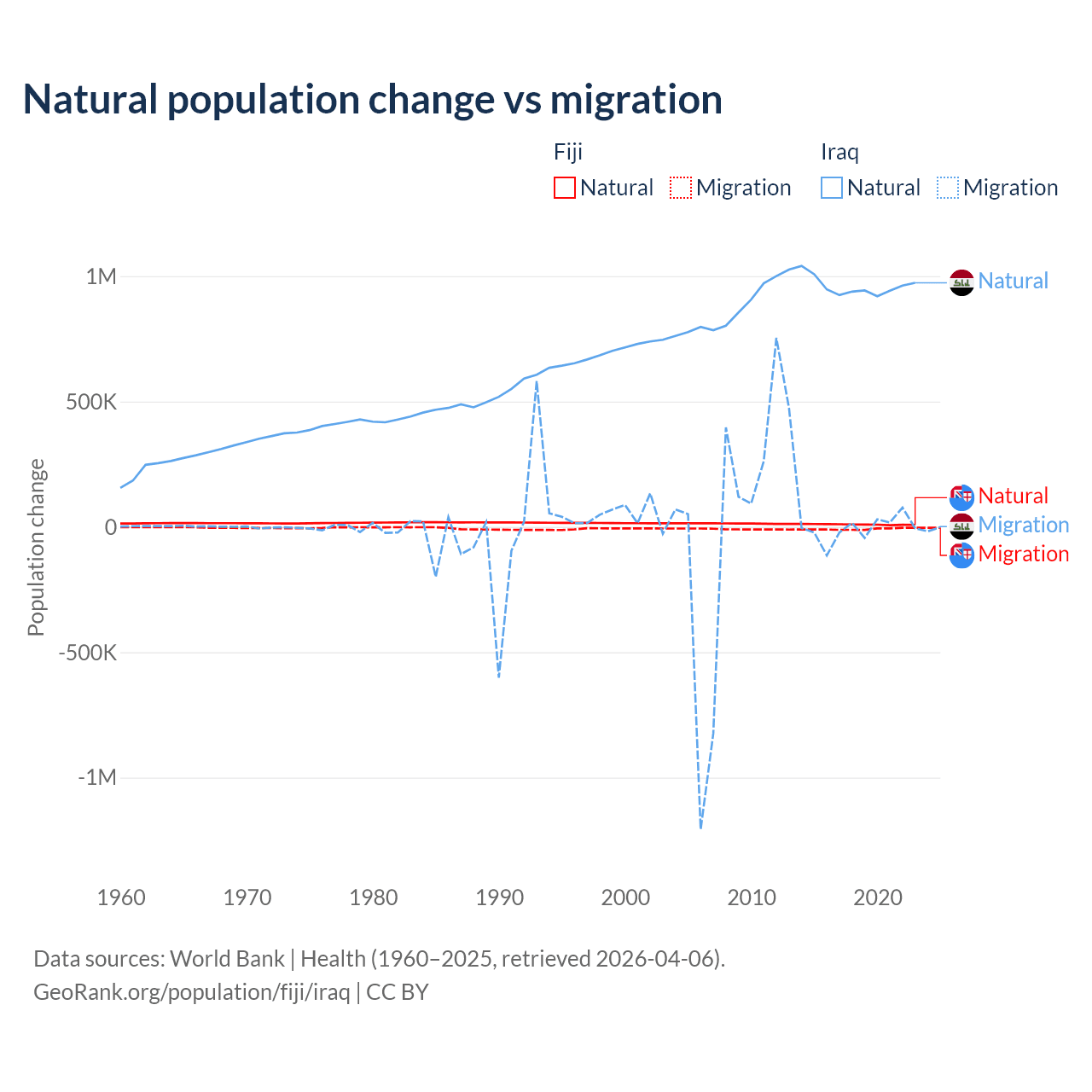 Over the last 10 years, 52.6% of the population change in Fiji is from natural causes (a gain of 94,971 people) and 47.4% is from migration (a loss of 85,415 people). In Iraq 99.2% is from natural causes (a gain of 9,598,842 people) and 0.76% is from migration (a loss of 73,050 people).