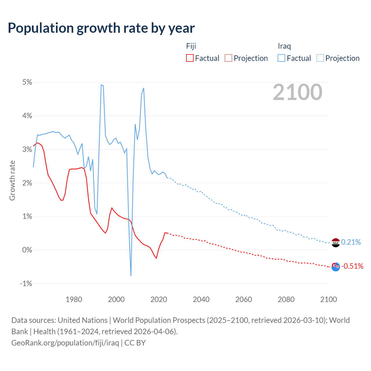 - For the last 10 years, Fiji has had an average growth rate of +0.12% per year vs +2.45% in Iraq.