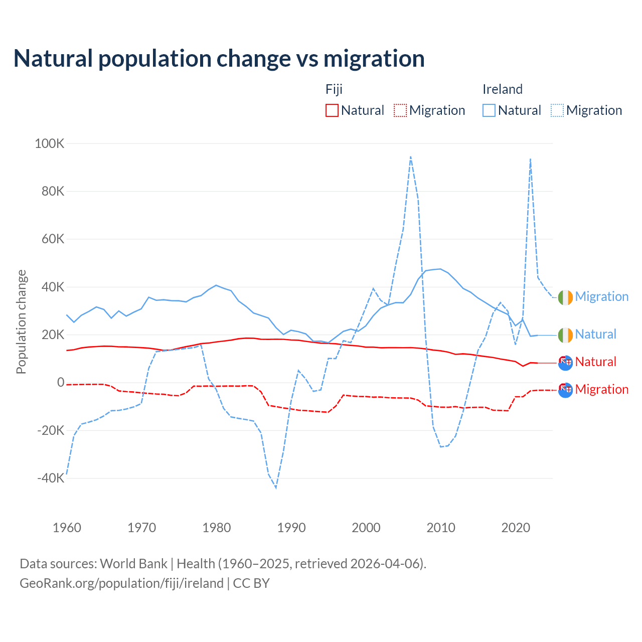 Over the last 10 years, 52.6% of the population change in Fiji is from natural causes (a gain of 94,971 people) and 47.4% is from migration (a loss of 85,415 people). In Ireland 48.2% is from natural causes (a gain of 284,644 people) and 51.8% is from migration (a gain of 305,297 people).
