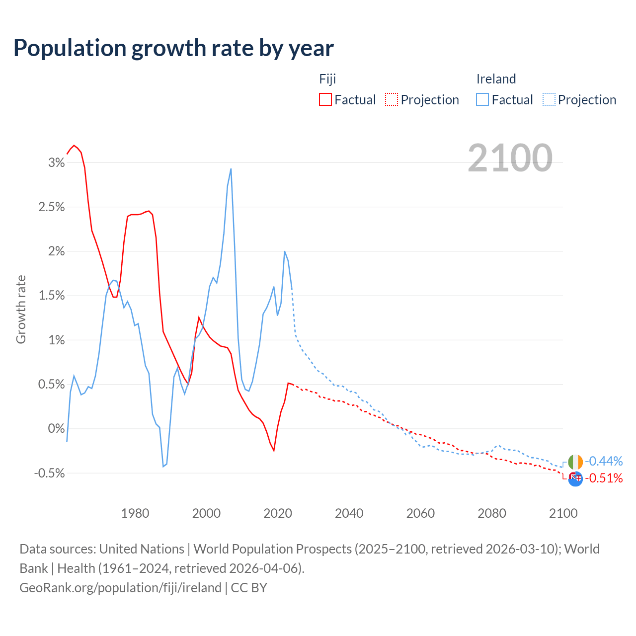 - For the last 10 years, Fiji has had an average growth rate of +0.12% per year vs +1.41% in Ireland.