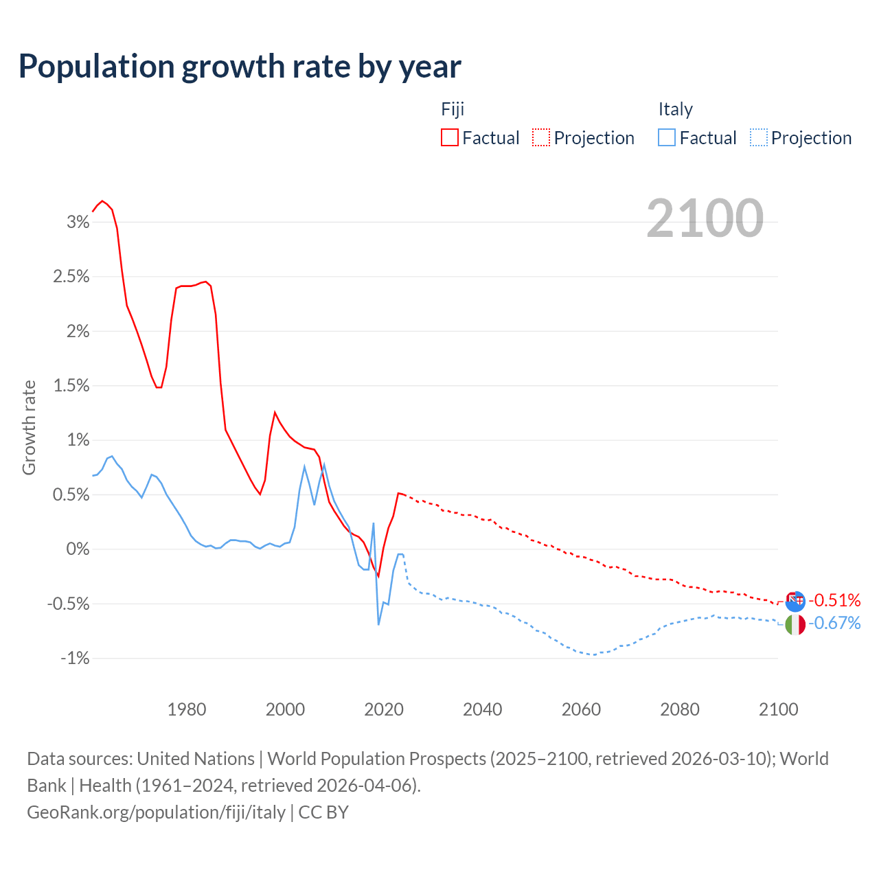 - For the last 10 years, Fiji has had an average growth rate of +0.12% per year vs -0.21% in Italy.