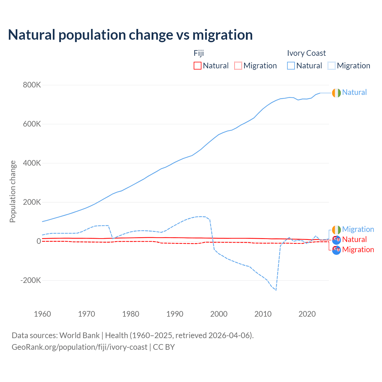 Over the last 10 years, 52.6% of the population change in Fiji is from natural causes (a gain of 94,971 people) and 47.4% is from migration (a loss of 85,415 people). In Ivory Coast 99.7% is from natural causes (a gain of 7,348,944 people) and 0.33% is from migration (a gain of 24,432 people).