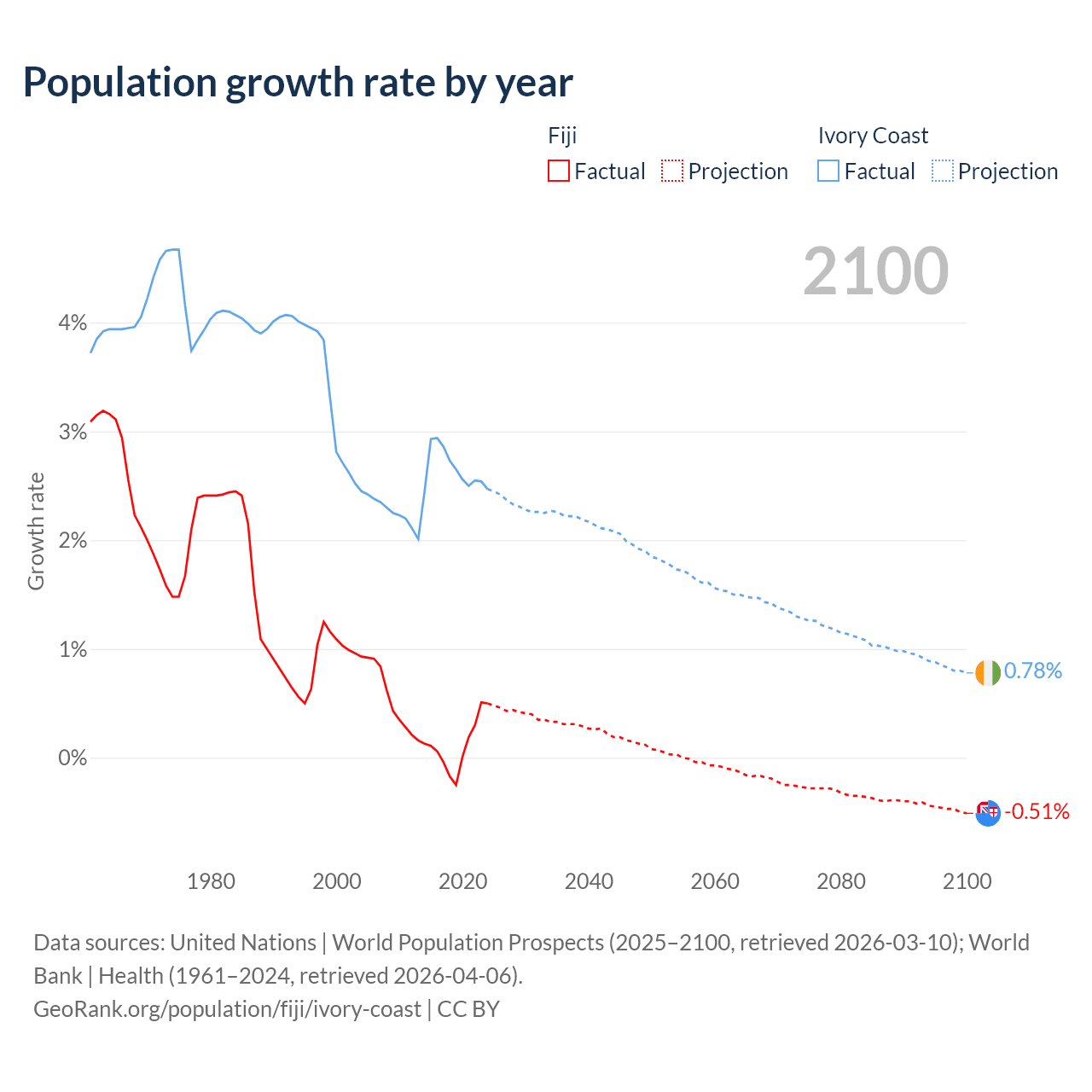 - For the last 10 years, Fiji has had an average growth rate of +0.12% per year vs +2.65% in Ivory Coast.