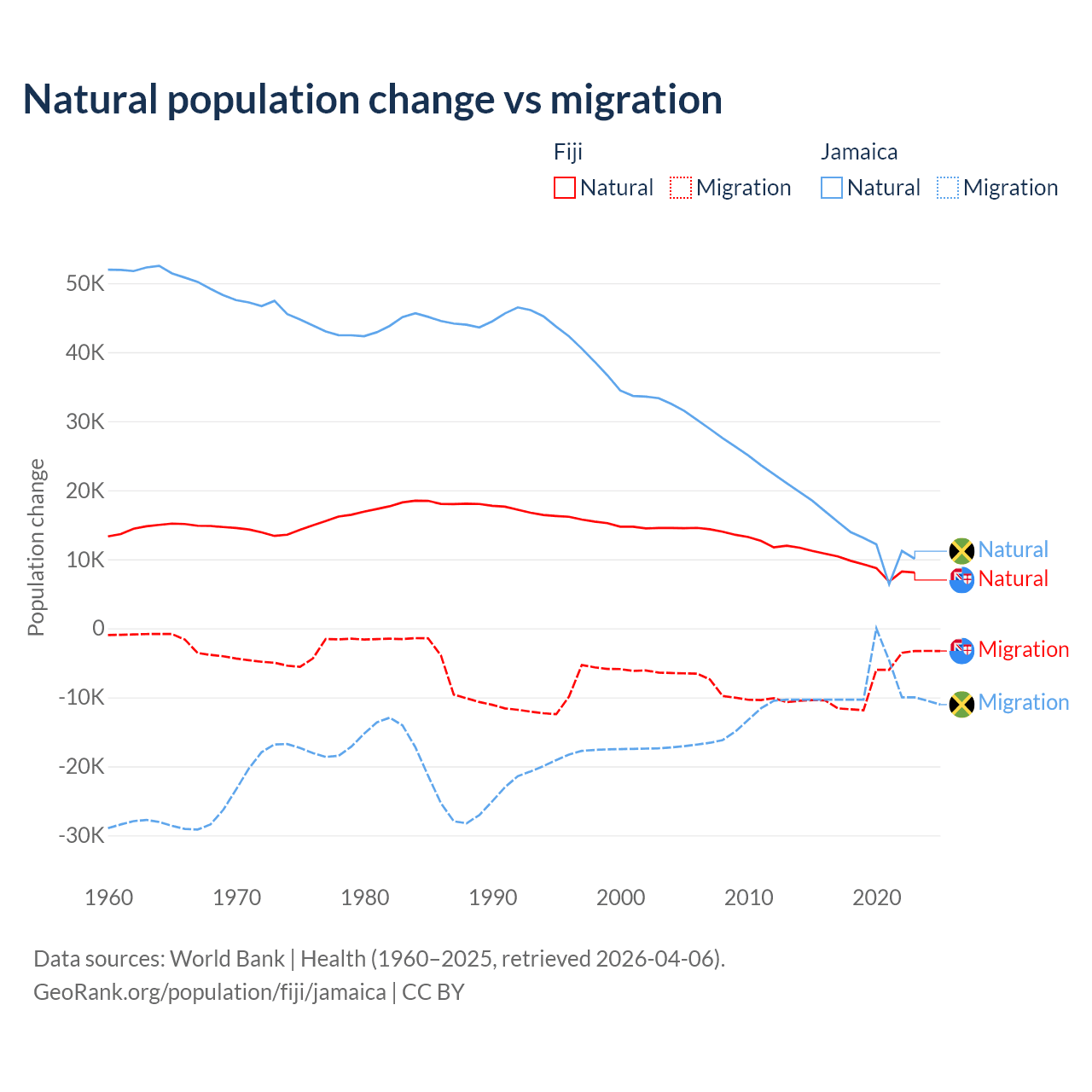 Over the last 10 years, 52.6% of the population change in Fiji is from natural causes (a gain of 94,971 people) and 47.4% is from migration (a loss of 85,415 people). In Jamaica 61.3% is from natural causes (a gain of 137,465 people) and 38.7% is from migration (a loss of 86,681 people).